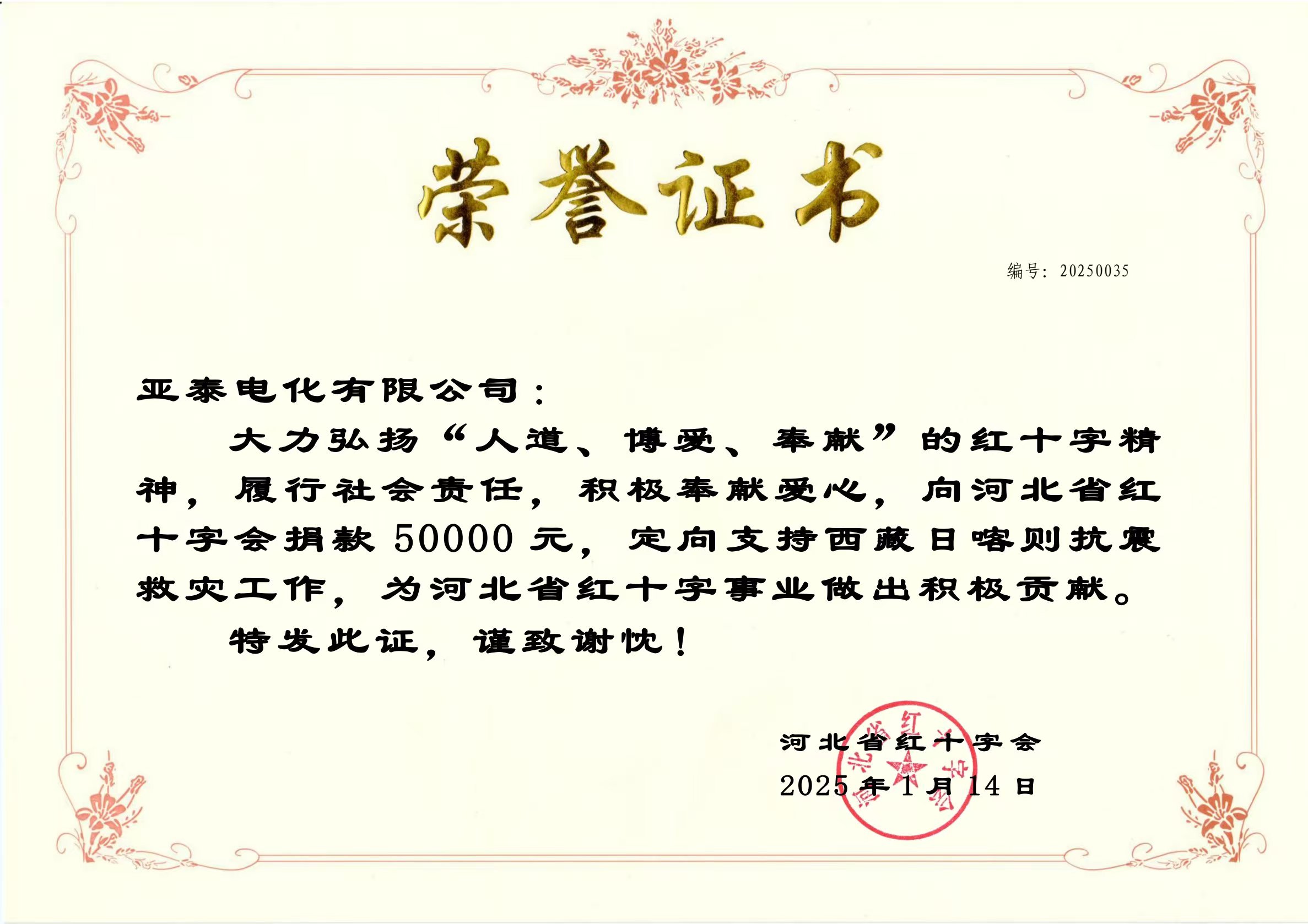 在公司領導的果斷決策下,第一時間從“亞泰愛心基金”中撥款5萬元人民幣,通過河北省紅十字會,定向支援西藏日喀則的抗震救災工作。我們希望通過這份綿薄之力,為災區(qū)人民帶去一絲溫暖和希望。